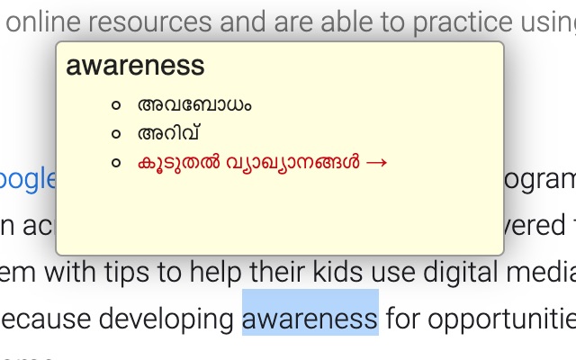 A Chrome extension that shows the Malayalam meaning of any word by simply double-clicking on it. A popup will appear with the meanings. Currently, it is not working because the API provider (Olam) has revoked access. I will update the code when I get some free time.